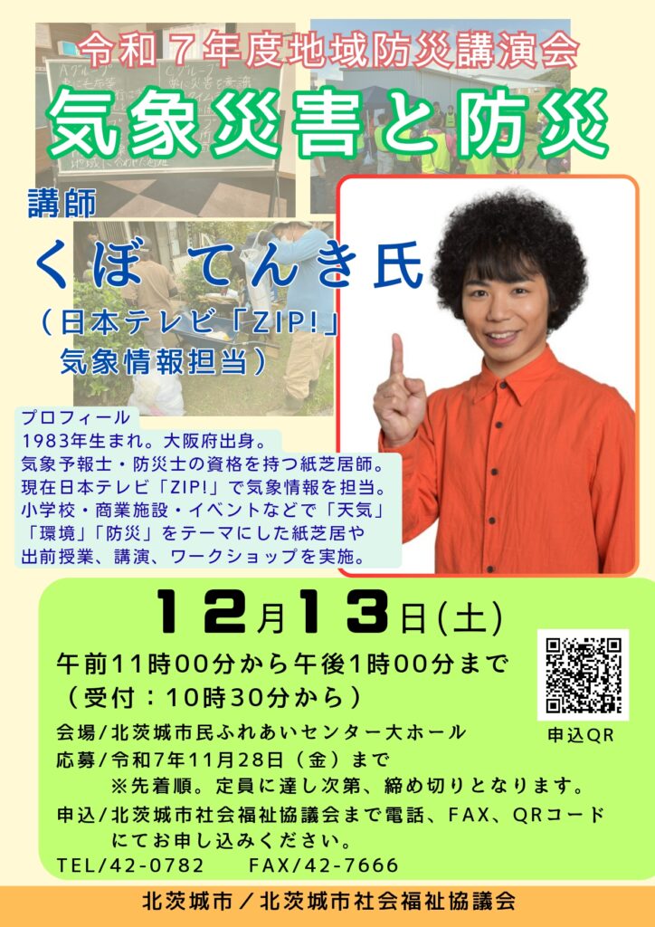 くぼ てんき 氏をお迎えし、「気象災害と防災について」ご講演いただきます。