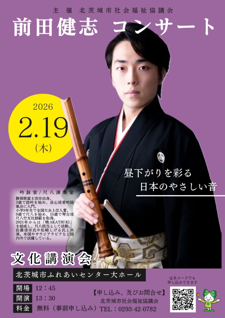 令和8年2月19日(木)北茨城市民ふれあいセンターにて前田健志コンサート(文化講演会)を開催いたします。