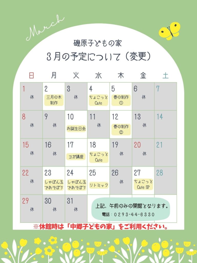 閉館に伴い、磯原子どもの家の開館日は以下のとおりです。